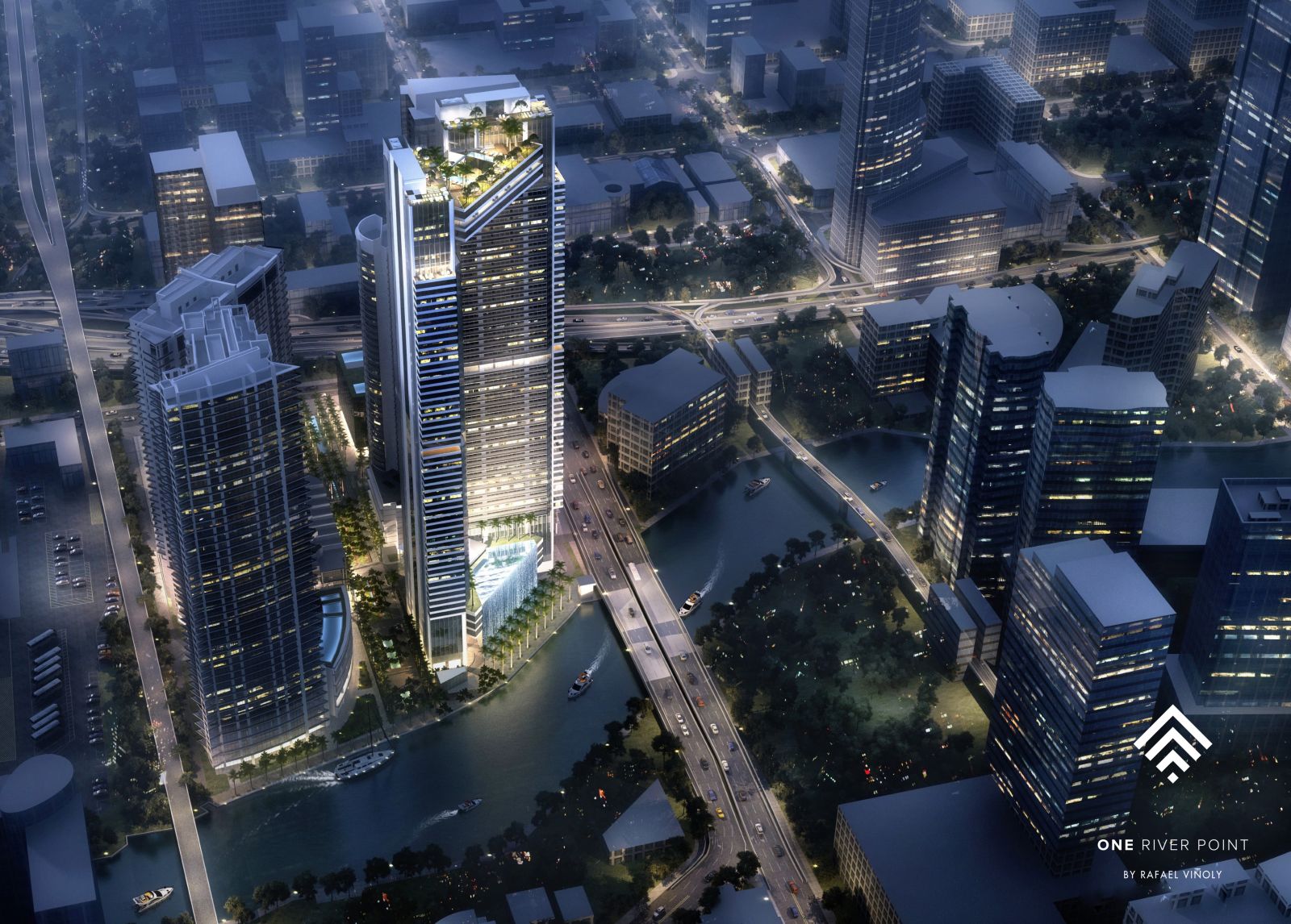 One River Point by Rafael Viñoly gives Miami's downtown renaissance its defining architectural statement. Two slender 60-story towers rise above a floating podium from which a serene waterfall cascades 85 feet to a shimmering pool below, appearing to flow into the Miami River. From its vantage point within the lush parkland setting, the elevated podium affords broad vistas across the river, the city, and to the bay beyond. The signature waterfall and the landscaped expansive River Promenade will be the focal point of arrival on the Miami River. Offset and perpendicular to each other, the towers are joined again at the summit by a 3-story Skybridge, creating an iconic silhouette on the downtown skyline. A vertical landmark rising out of a thriving landscape in the heart of downtown Miami, One River Point fulfills the promise of this unique location. The location affords privileged proximity to everything that is making Miami, America's rising capital of commerce and culture. The high-fashion and fine-dining experiences of Brickell City Centre are a short walk away. The diverse restaurants and bars of Miami's burgeoning Riviera are close by, while the Arts and Cultural District, Miami's Design District, and the cool creative community of Wynwood are all in close proximity. The ocean beaches of South Beach, Mid Beach, and Miami's international airport are all quickly accessible. The riverfront parkland fully complements the urban setting, with shady palm-fringed terraces creating a relaxing retreat from the vibrant streets beyond. Diverse gourmet experiences; boutique hotel style ambience and amenities; and the exclusive Sky Club, curated by Adrian Zecha, combine to create a truly unique environment and experience. In One River Point, Viñoly proves definitively that landmark luxury doesn't have to be built on sand.