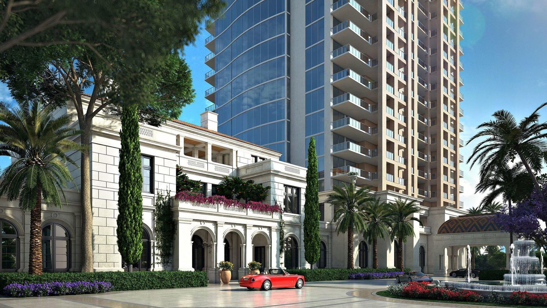 - Large 3-story Mediterranean villa styled building located between both towers will feature over 50,000 square feet of amenities, including restaurants, lounges, gym, spa and much more